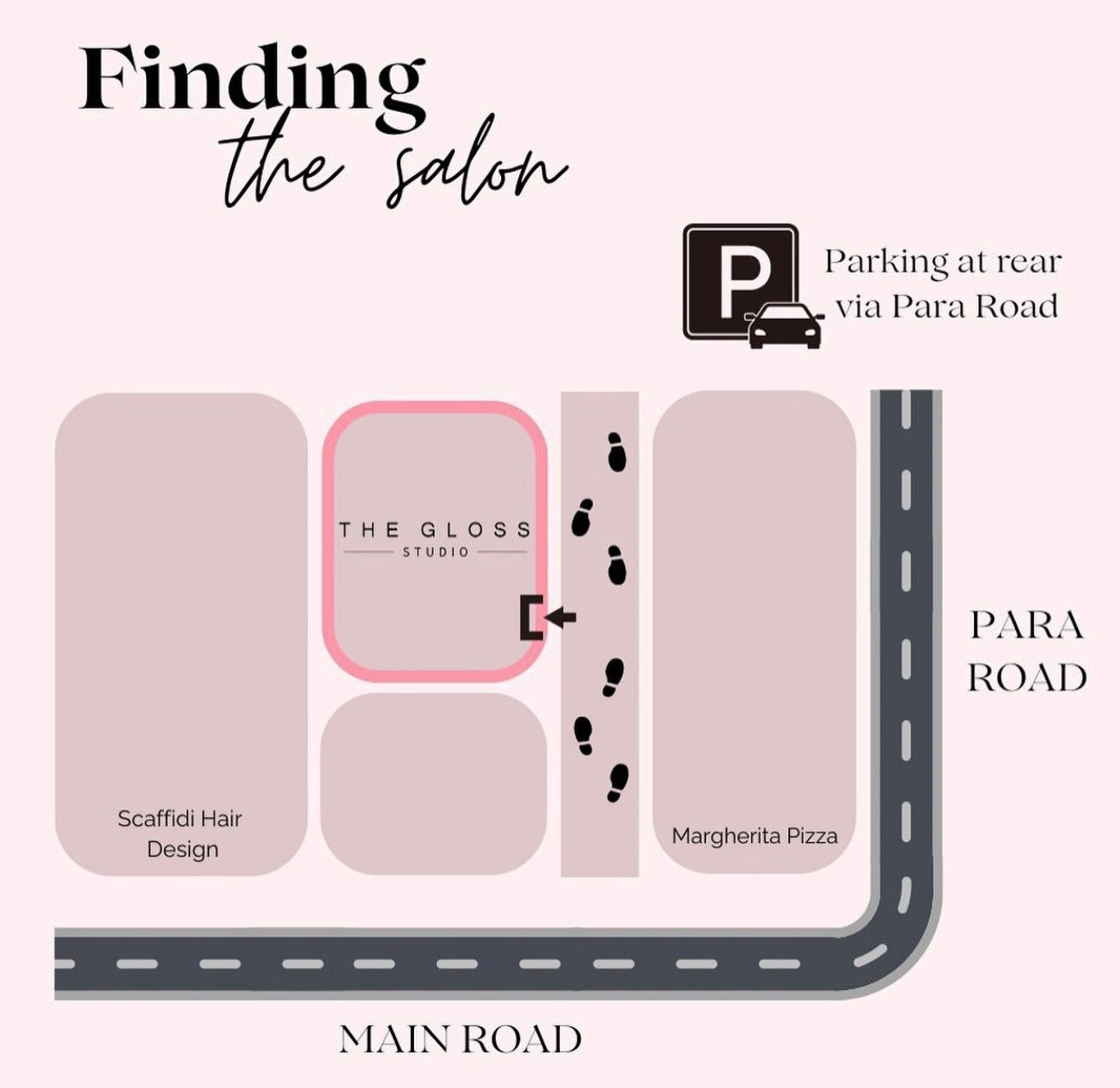 The best parking is at the rear of the shops (enter via Para Road). When you park there, you will easily find us (You wont miss the hot pink sign!)